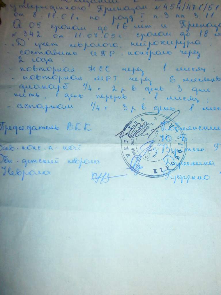 Добрый вечер. извините за позный очёт вчера приехали уставшие севодня была гроза небыло сети. Ездили в киев посмотрел нас наш лечищей нейрохирург шунт работает хорошо желудочки уменчились больше чем на пол см мозг расправился. после поехали в институт ортопедии прочитала у Нели в темке што они туда ездили на консультацию попросила у своего лечищого н/х направление так как раньше мы наблюдальси у часного ортопеда. Смотрел нас Неуш М.М. отправил на узи и к невропатологу Невропатолог посмотрела росписала лечение рекомендации Очень много купать в воде лутше розвиваються рефлексы пошли на удз Планы совсем поменялись Мы ехали в Киев на електро стимуляции но врач сказал што не стоет етого делать потомушто есть очень серёзная проблема а правом бедре недорозвинута кость несформирувалась чашечка для упора кости и если не одеть аппарат и не начать лечение немедлено то когда малышка начнёт ходить одна ножка будет короче другой. Врач сказал еслибы сразу начали лечение после операции то малишка былабы уже здорова но нам нихто не сказал были у троих ортопедов все говорили только про е/c щас лечение продица намного дольше самое главное што всёже вылечимся Ортопед сказал што малышка будет ходить только поже чем все детки всё зависит от того как удачно била зделана операция на спинке насколько быстро возбновляца нерви повреждёные. щас малышка в арарате контроль через три месеца