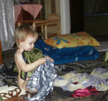 Саша у нас хочет видемо дизайнером стать, платки мои и шарфы шейные таскает))) А там где плачет, это она браслет мой порвала и разревелась почему-то ((( я ее не ругаю сильно за такие вещи... |