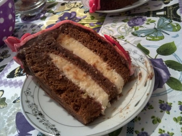 Кстати, разрез: шокобисквит, малиновый джем, грецкие орехи, сметанный крем. Не представляю как там орехи, но муж заказчицы очень просил))