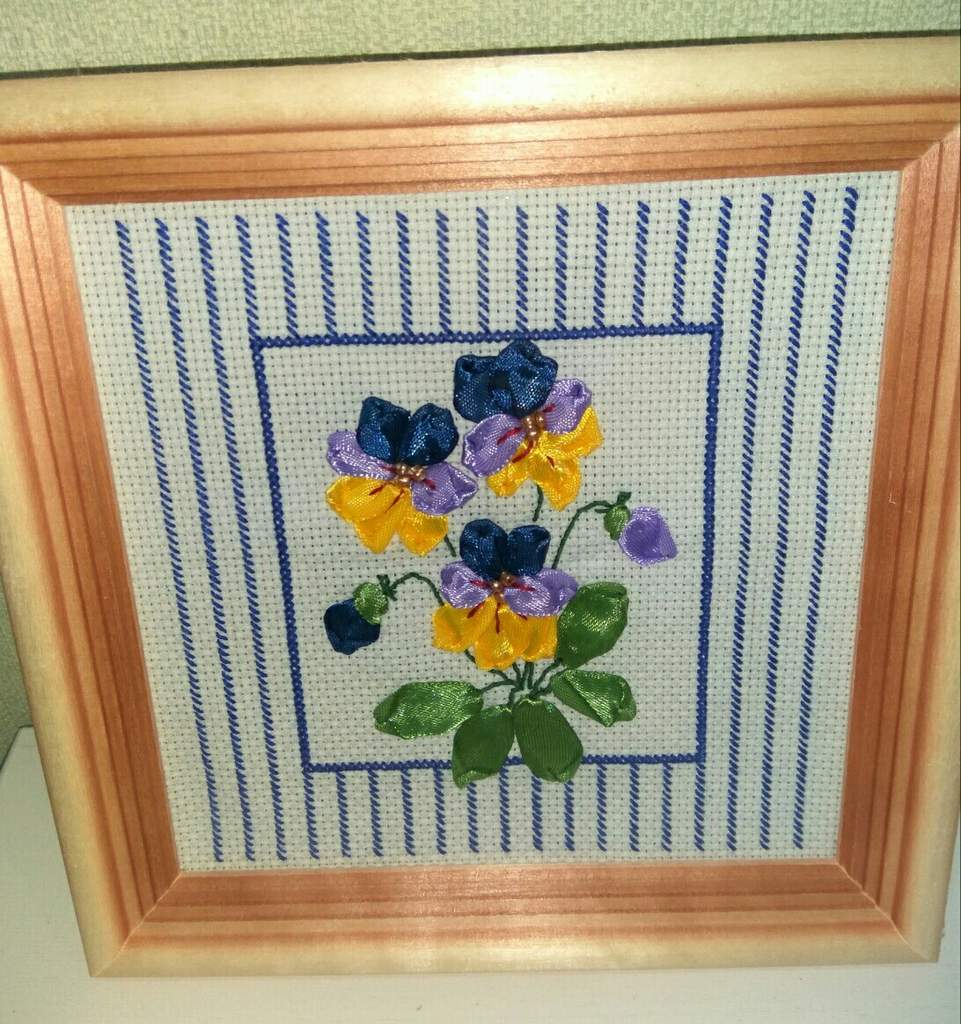 Доделала свою первую маленькую вышивку лентами, вот результат) отличается процесс от вышивки крестом, не понравилось больше всё то что ленты тяжело протаскивать через канву и другие ленты, приходилось пассатижами помогать) а понравился результат как получается в итоге ) оформлять тоже не ясно как - под стекло - ленты сплющивается, рисунок портится, а без стекла запылится наверное... Нужно двойную рамку в идеале как под бисер обычно делают...