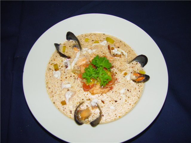 3. Морковку, капусту и картошку измельчить и разложить по тарелкам, разлить бульон с морепродуктами.