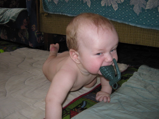 Дброе утро,вчера засняла Ваську с лимонкой.Любит же он с игрушками во рту ползать