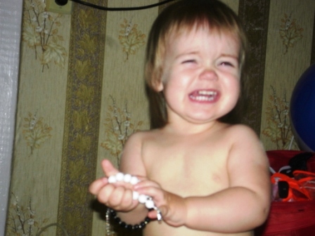 Саша у нас хочет видемо дизайнером стать, платки мои и шарфы шейные таскает))) А там где плачет, это она браслет мой порвала и разревелась почему-то ((( я ее не ругаю сильно за такие вещи... |