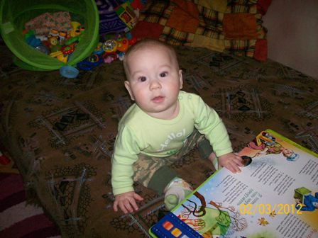 А в том же посте первая фотка, он там сидит, а что не видно там Еще не очень уверенно, но уже не заваливается. Думаю еще неделька, и будем еще и вертеться сидя))))