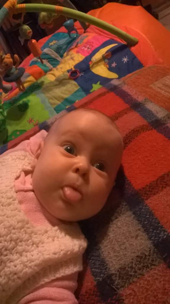 переворачивается на живот(тяжело только ручки достать из под себя), гулит, болтает, улыбается, смеется, играет с игрушками, животик беспокоит редко но бывает. Любит ходить на ручках маминых, лежать долго не любит
