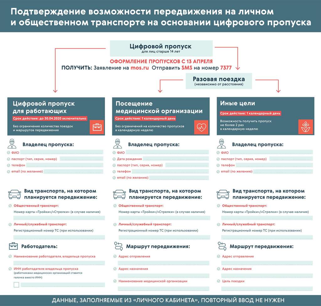 С13.04, обязательным станет с 15.04.19.Система цифровых пропусков позволит уменьшить количество людей, выходящих на улицу и пользующихся общественным транспортом. От этого напрямую зависит, как город справится с пандемией коронавируса. С 15 апреля для поездок по Москве и Московской области на личном и общественном транспорте потребуются специальные цифровые пропуска. Начать их оформление можно будет с понедельника, 13 апреля. Со среды, 15 апреля, наличие цифрового пропуска для поездок станет обязательным. Ходить пешком пока можно без пропусков, но при этом строго соблюдать установленные правила и ограничения. Пропускная система носит заявительный характер. Получить цифровой пропуск сможет каждый, а перечень уважительных причин для поездок является открытым. Городские власти оставляют за собой право проверить достоверность сообщаемых сведений. Пропуска будут представлять собой специальный код, состоящий из цифр и букв. Первые четыре знака обозначат дату окончания срока действия пропуска, а остальные 12 знаков позволят идентифицировать его владельца и цель поездки. QR-код на пропуске обеспечивает быструю проверку сведений сотрудниками контролирующих органов. Система будет включать в себя несколько категорий цифровых пропусков. Первая будет предназначена для поездок, связанных с осуществлением трудовой деятельности. Такой пропуск будет нужен в случае, если организация продолжит работать и присутствие сотрудника на рабочем месте абсолютно необходимо. Эта же категория пропусков будет нужна для служебных разъездов, например, для доставки товаров курьерами. Срок действия цифрового пропуска для поездок на работу — до 30 апреля. Вторая категория пропусков — для поездок в медицинские учреждения, в том числе в качестве сопровождающего лица. Такие пропуска будут использоваться для поездки в конкретное медицинское учреждение. Количество выдаваемых в течение недели таких пропусков не ограниченно. Третья категория — разовый пропуск для поездок в других личных целях, соответствующих режиму повышенной готовности (в магазин, на дачу, на вокзал и так далее). Пропуск этой категории выдаётся на один день и разрешает поездку до места назначения и обратно. Получить такой пропуск можно будет два раза в неделю. Пропуска не нужны, чтобы выгулять собаку в пределах 100 метров от дома или вынести мусор на ближайшую контейнерную площадку. Цифровой пропуск можно будет получить бесплатно тремя способами. Онлайн на mos.ru. Для этого пользователям нужно авторизоваться на портале, выбрать услугу «Получение цифрового пропуска для передвижения по территории города Москвы» ввести необходимые данные и подать заявку. Для передвижений на автомобиле потребуется указать его марку и номер, а если нужно будет ехать на общественном транспорте — понадобится номер карты «Тройка» или «Стрелка», а также ИНН организации или наименование медицинского учреждения, в которое вы направляетесь. Система отобразит на экране специальный код, который надо будет сохранить — записать, сфотографировать или сделать скриншот — и взять с собой. Одновременно пропуск будет выслан на электронную почту. Начать оформление цифровых пропусков можно будет с понедельника, 13 апреля. Со среды, 15 апреля, наличие цифрового пропуска для поездок станет обязательным. Ещё один способ оформ