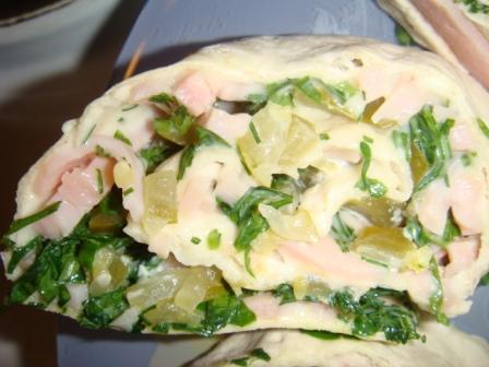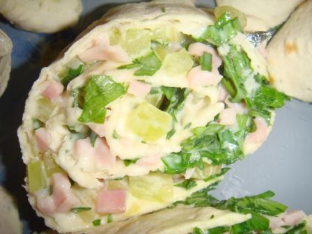 мелко нарезала соломкой ветчину зелень, солёные огурчики. Закатала в фольгу и в холодильник на час. (мужу понравилось больше в горячем виде, подогретые в микроволновке 15 сек.