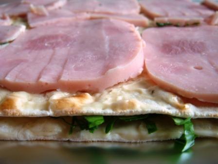 2 слой,тонко нарезала ветчину Закатала в фольгу и в холодильник на час. P.S такой вид рулетика лучше не греть, иначе он становится сухим.