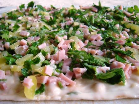 1 слой,лаваш смазала майонезиком с чесночком, посыпала обильно зеленью.