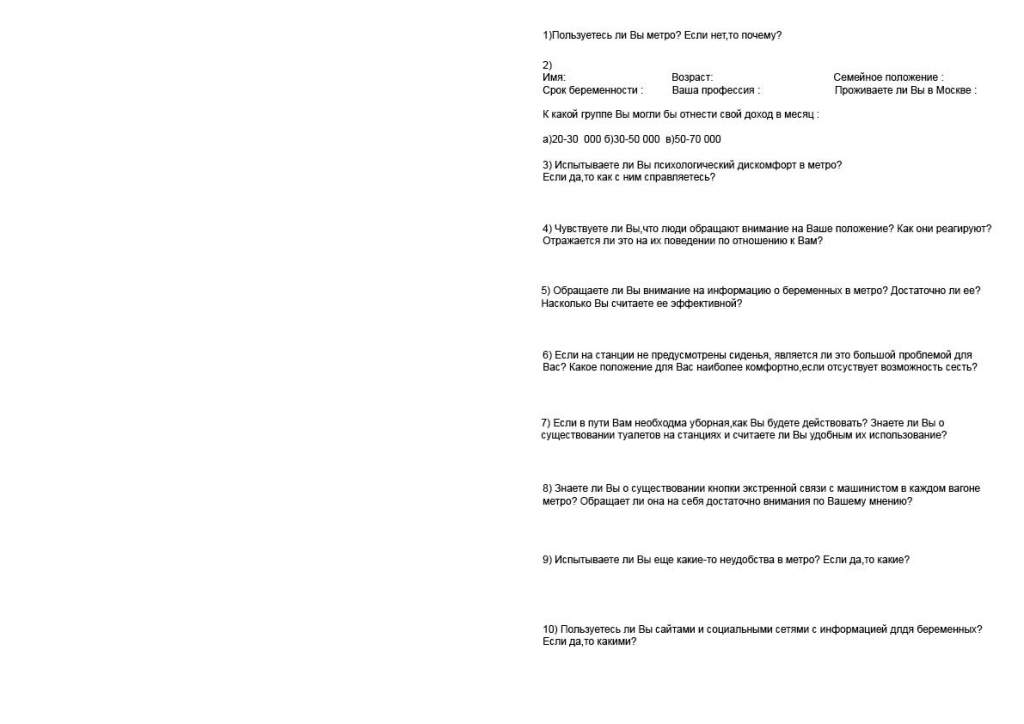 Я работаю над проектом,в основе которого идея создания продукта для беременных женщин,способного упростить их пользование общественным транспортом или же некая реорганизация его самого. Одним из этапов моей работы является социальный опрос по темам,интересующим меня в ходе исследования. Я буду очень благодарна Вам,если Вы ответите хотя бы на часть моих вопросов (в приложенном файле). Заранее благодарю Вас за Вашу помощь и желаю Вам крепкого здоровья и счастливой семьи.