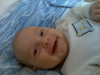 Сейчас часто улыбается, так весело, сначала ротик открывает и прям во весь беззубый рот улыбается, меня это так умиляет))) у него ещё такая ямочка милая на правой щечке появляется