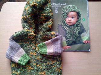 вот только шлем пока не одеть! орет)))) из шапок только пока чепцы позволяет на себя одеть))) я чепчик кладу в капюшон комбенезона и Гошку прямо вдеваю в эту конструкцию, а веревочки завязываю уже при выходе из подъезда! |