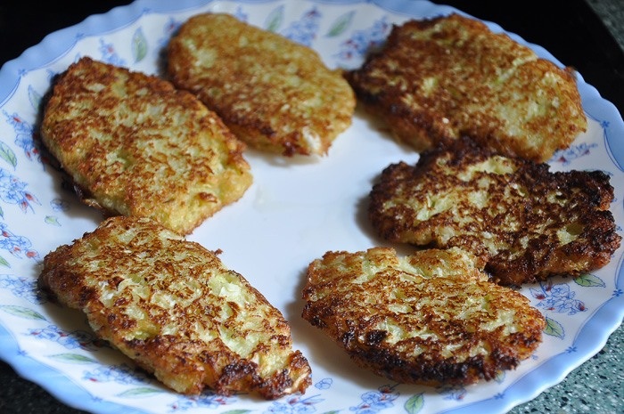 Наверх салата выложить остатки обжаренного картофеля, сделать в центре углубление и придать ему форму гнезда.