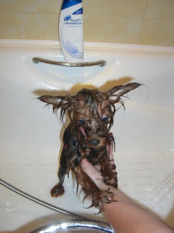 Вот на этой фотке собаки и похожи )))))) Моя тоже мыться не любит вообще! Если скажешь Клова, пошли купаться, она в самый дальний угол прячется Зато потом очень любит эффект!
