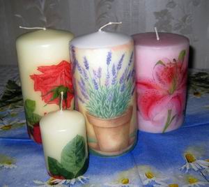 Еще один легкий способ декорировать свечи. Надо только найти подходящую бумажную салфетку с понравившимся рисунком. Салфетки, как правило, трёхслойные, поэтому для тонкости работы нужно отделить два слоя и работать с третьим, на котором находится рисунок.