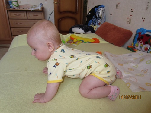 Леська у меня научилась-таки твердо стоять на четвереньках, теперь постоянно сидит и раскачивается, так забавно смотрится))))