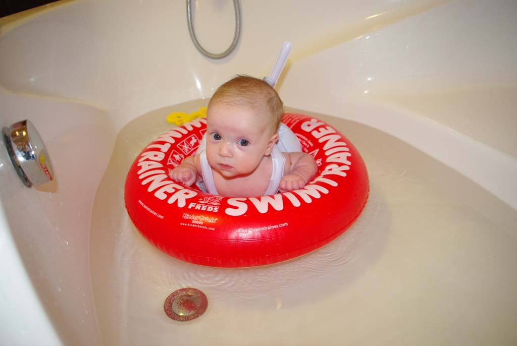 Прямо руками доча давила снизу и он с шеи перескакивал ей в рот)))Перестали с кругом ее купать.А начали где-то в месяц купаться.