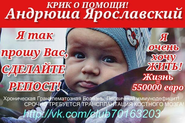Малыш очень хочет жить! Родители умоляют Бога и всех небезразличных людей помочь Андрюше! Сумма огромная, совершенно неподъемная для их семьи. Очень много средств уходит на нынешнее лечение и поддержку здоровья ребеночка... Они будут очень благодарны за любую помощь и поддержку: финансовую, информационную , молитвенную...