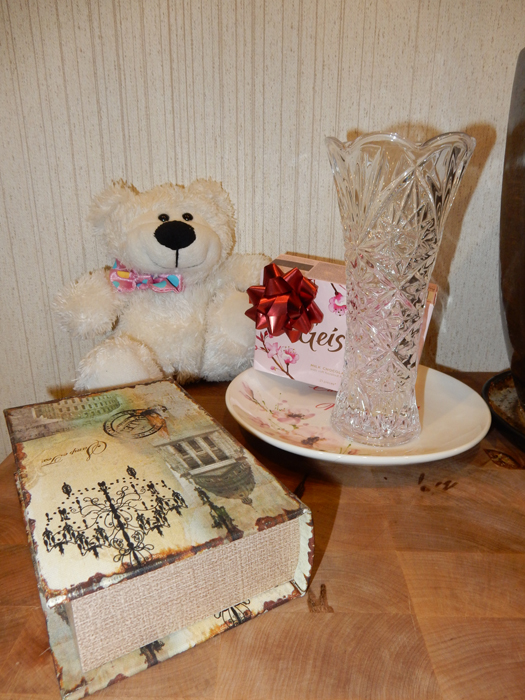 У нас сейчас финансово непросто. Сегодня скромно получила букетик тюльпанов. Сами по себе не люблю, но цвет мне понравился. К букетику торт, конфеты, маршмеллоу (правда я маленькие хотела, в кофе добавлять, а получила большие). Открытку от сына. Получит деньги, поедем оправу выберем. Зрение село, думаю пора обзавестись очками. Вот и будет от мужа подарок. Папа мой подарил деньги. Мама торт испекла в подарок и бутылочку вина передала