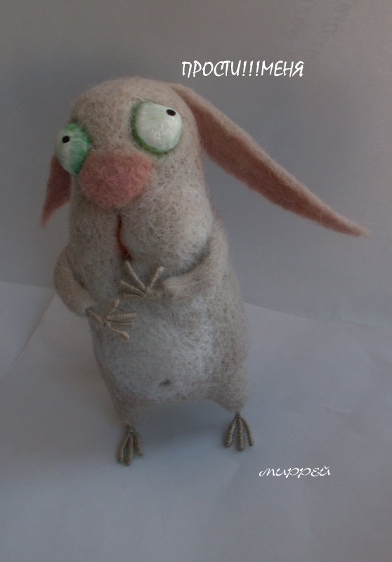 уши))) просто беру совсем немного шерсти и на паролоне иголкой уваливаю ,если надо можно всегда добавить по чуть чуть шерсти, а вот убрать не получится!!! а потом в конце край обрабатываю-и вот тут у меня всегда пальцы исколоты в кровь уж очень тоненькие ушки