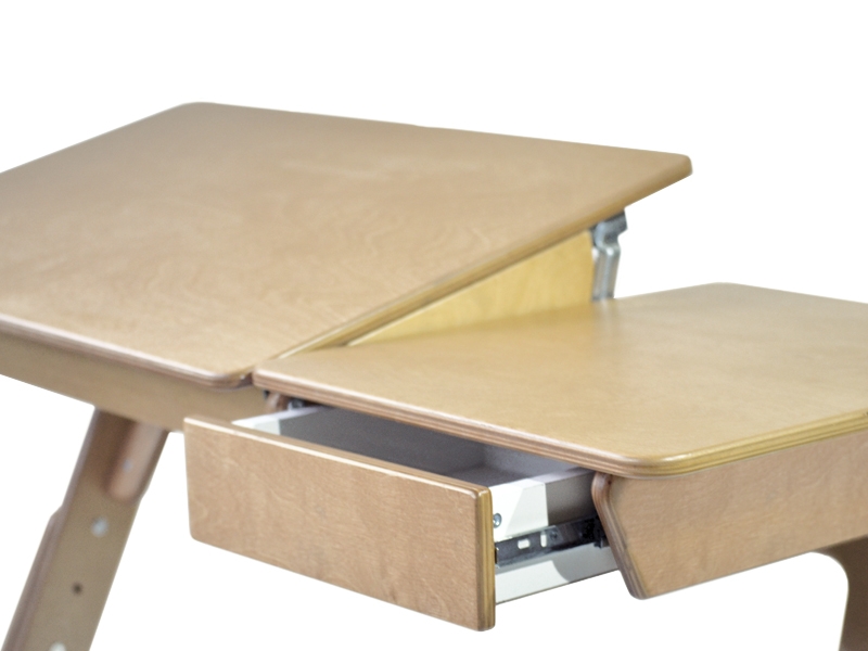 Там две части столешницы, одна меняет угол, другая неподвижная, к ней ящик крепится. Но у нас есть художник-вандал, поэтому я карандаши, ручки, фломастеры и пр. Поднимаю, пока в ящик ничего складывать не будем