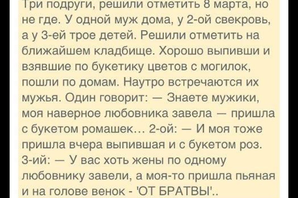 ...Мой муж в своем репертуаре!Ну не любит он 8е марта! Цветы все же купил и поздравил, но вчера, смешной...А подарок я заказала, выбирал он, пальто на весну...сегодня я работаю, а у него выходной, так что надеюсь на романтический ужин,он вкусно очень готовит, надеюсь удивит как всегда