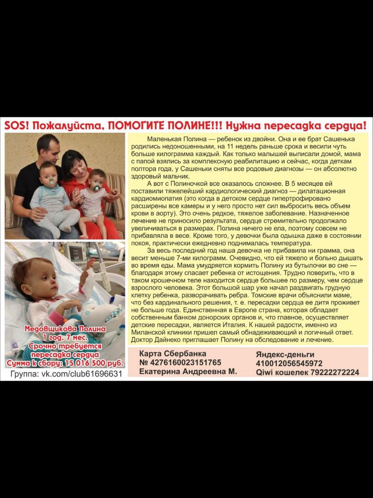 Взяться за лечение Полины решились итальянские медики. В настоящий момент девочка в Милане, она в листе ожидания на пересадку сердца. В сборе средств на срочную трансплантацию участвуют несколько фондов, но времени катастрофически МАЛО!