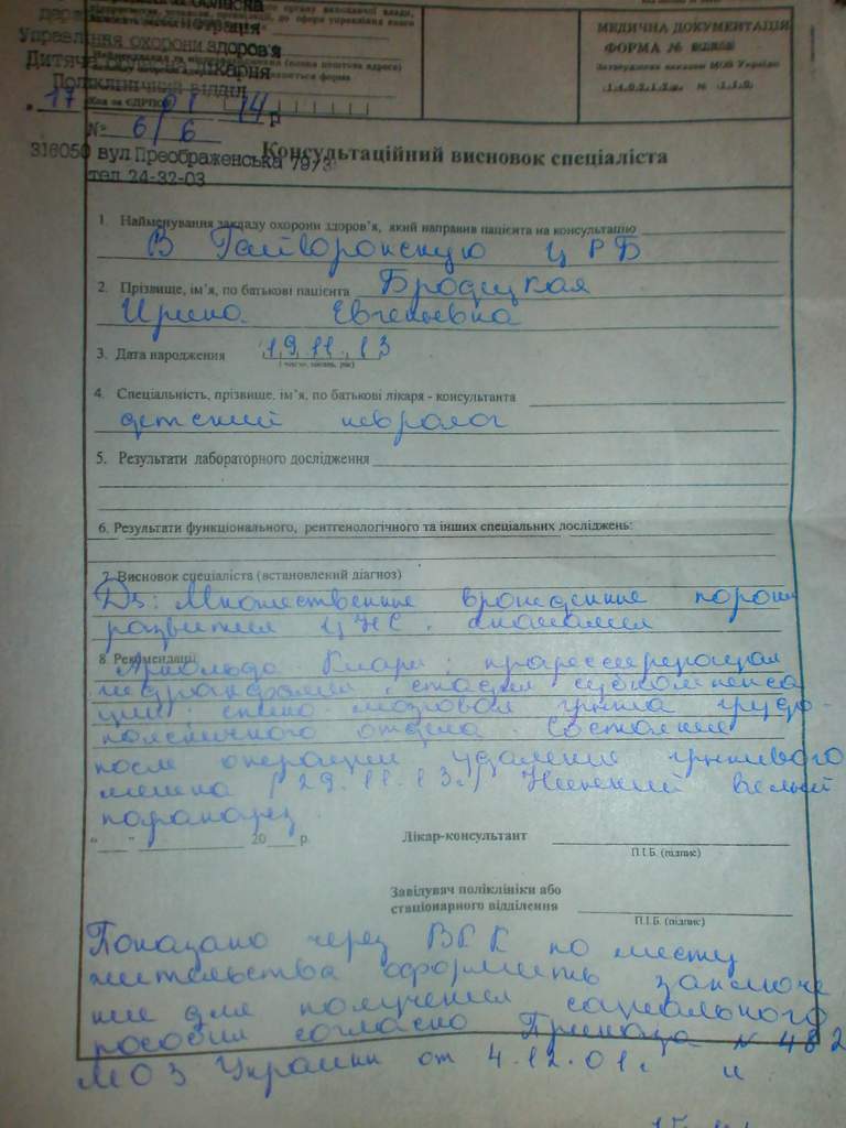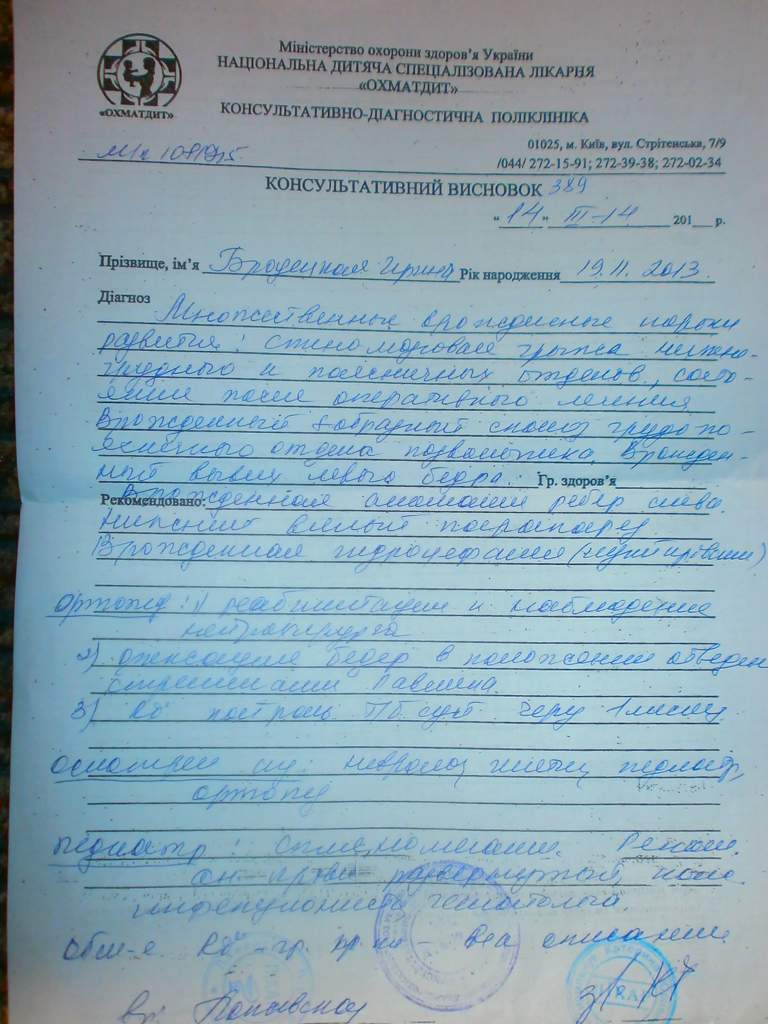 ---------Здраствуйте. Меня зовут Юлия, прошу помощи у не безразличных людей. У меня родилась доченька Ира 19.11.2013.р.н. з диагнозом множественные врожденные пороки розвития цнс аномалии Арнольда Киари: прогрессирующая гидроцефалия стадии субкомпенсации; спино-мозговая грыжа грудо поясничного одела нижний вялый паранарез било две операции удаления грыжового мешка(29.11.2013) шунтирование (06.03.2013). Кроме того у Иришки дисплазия тазобедреных суставов, вывих правого бедра, деформация позвоночника, нет 3 ребра. Нужно лечение и реабилитация на которое у нас уже нет денег посколько от самого рождения ездим по больница м. в 13 часов после рождения малышку забрали в реанимацию детского оделения хирургии где поже била зелана операция. по удалению грыжи после чего начала прогресирувать гидроцифалия. Нужно ищо масажи електро стимуляции для разрабативания ножек (они не работают ) Я из многодетной семи папа у нас умер мама отказалась иза водки. Муж работает но денег серавно категорически не хватает. поетому обращаюсь к вам за помощю помогите мне пожалуста вылечмть мою доченьку буду очень благодарна.номер по которому со мной можно связатся 0966531677 (Юлия)номер карти ПриватБанка 5168757222666390 получатель Бродецька Ю.М.
