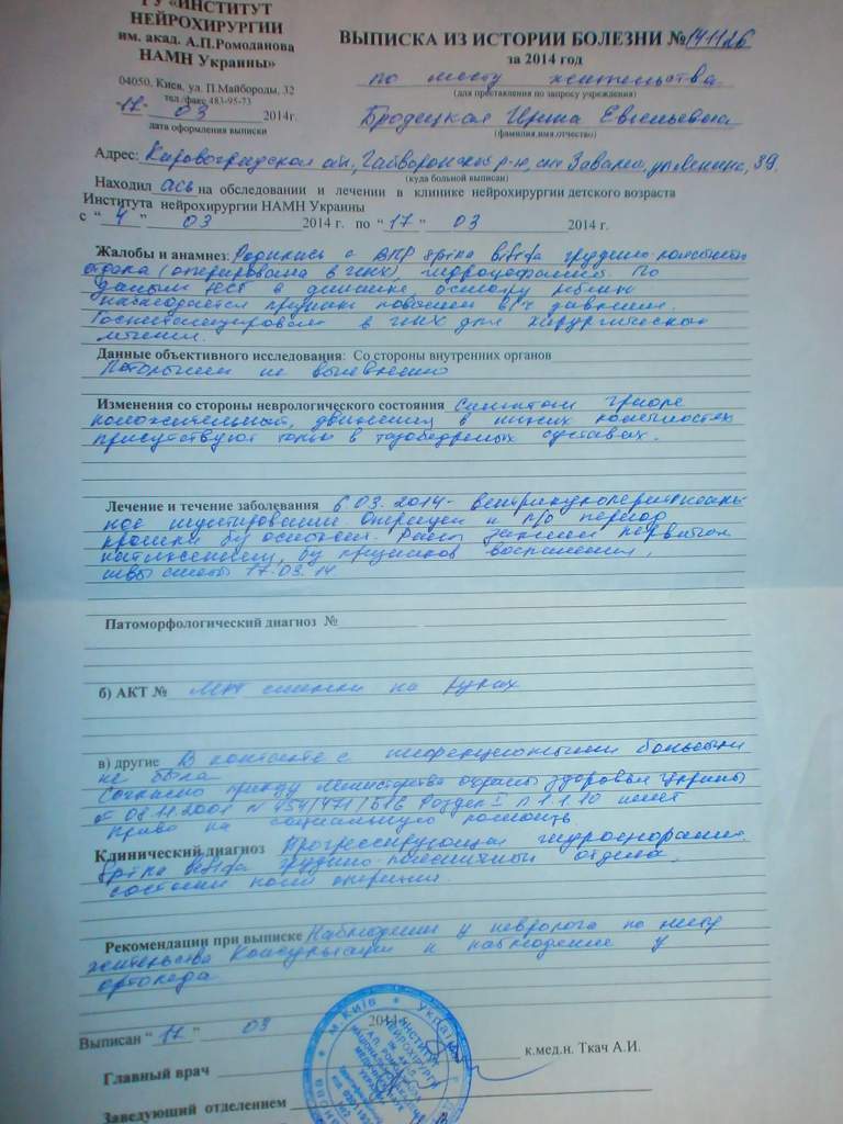 Добрый вечер. извините за позный очёт вчера приехали уставшие севодня была гроза небыло сети. Ездили в киев посмотрел нас наш лечищей нейрохирург шунт работает хорошо желудочки уменчились больше чем на пол см мозг расправился. после поехали в институт ортопедии прочитала у Нели в темке што они туда ездили на консультацию попросила у своего лечищого н/х направление так как раньше мы наблюдальси у часного ортопеда. Смотрел нас Неуш М.М. отправил на узи и к невропатологу Невропатолог посмотрела росписала лечение рекомендации Очень много купать в воде лутше розвиваються рефлексы пошли на удз Планы совсем поменялись Мы ехали в Киев на електро стимуляции но врач сказал што не стоет етого делать потомушто есть очень серёзная проблема а правом бедре недорозвинута кость несформирувалась чашечка для упора кости и если не одеть аппарат и не начать лечение немедлено то когда малышка начнёт ходить одна ножка будет короче другой. Врач сказал еслибы сразу начали лечение после операции то малишка былабы уже здорова но нам нихто не сказал были у троих ортопедов все говорили только про е/c щас лечение продица намного дольше самое главное што всёже вылечимся Ортопед сказал што малышка будет ходить только поже чем все детки всё зависит от того как удачно била зделана операция на спинке насколько быстро возбновляца нерви повреждёные. щас малышка в арарате контроль через три месеца